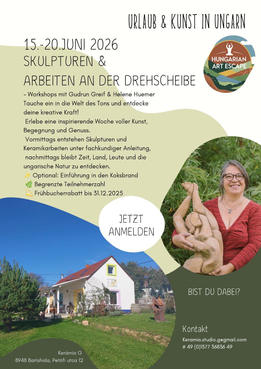 Workshops Immerse yourself in the world of clay and discover your creative power! Experience an inspiring week full of art, encounters and enjoyment. In the mornings, sculptures and ceramic works are created under expert guidance. In the afternoon, there is time to discover the country, its people and Hungarian nature. Beautiful apartments are available within a radius of 10 km.